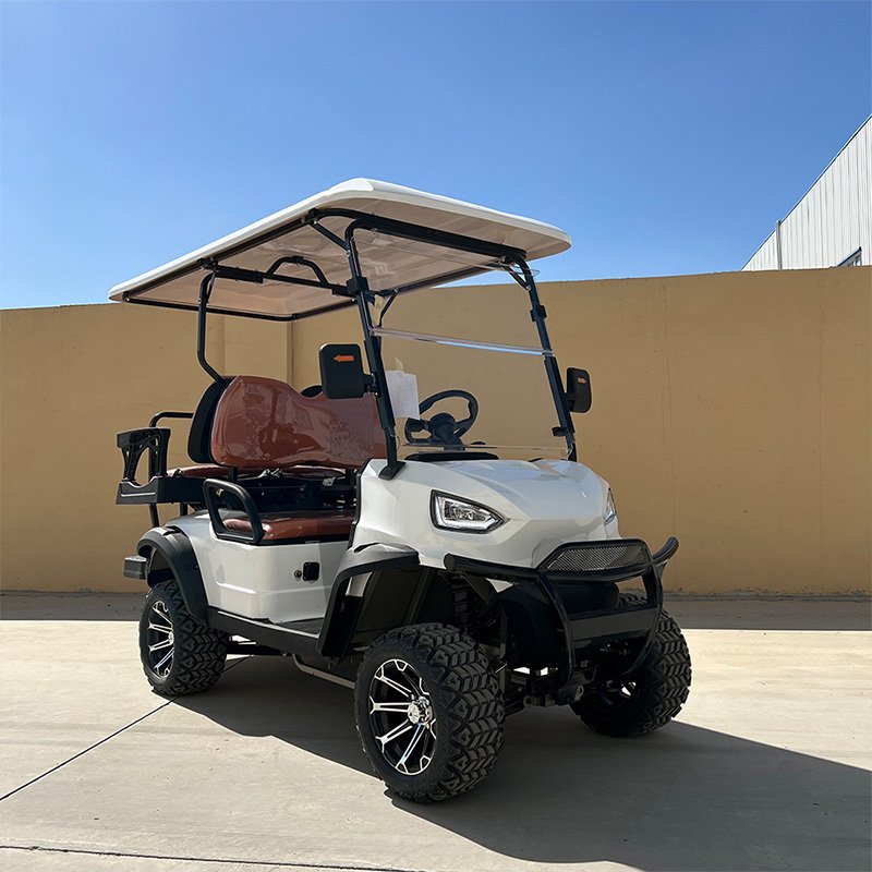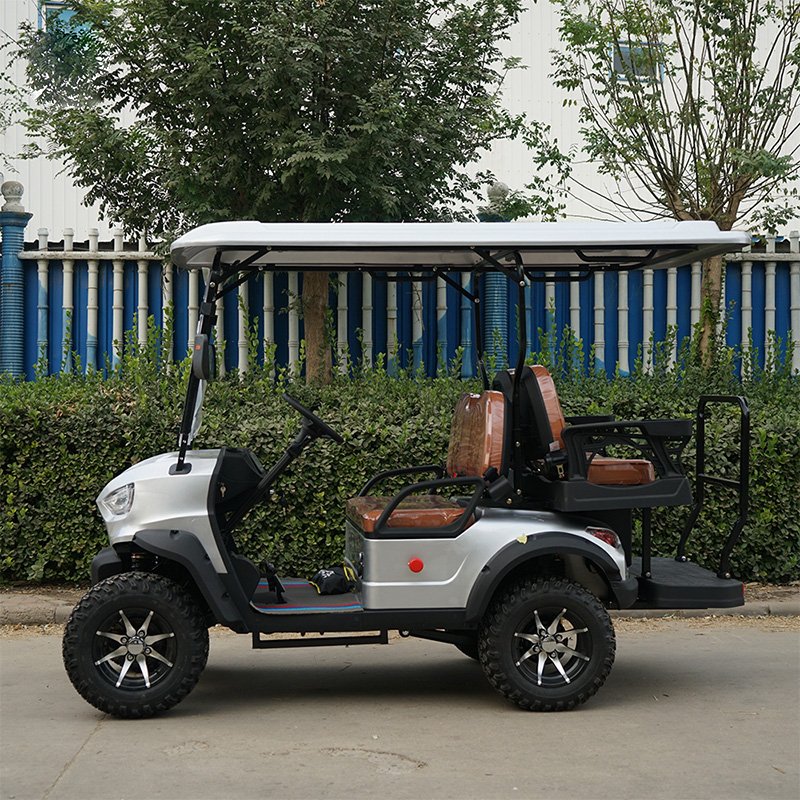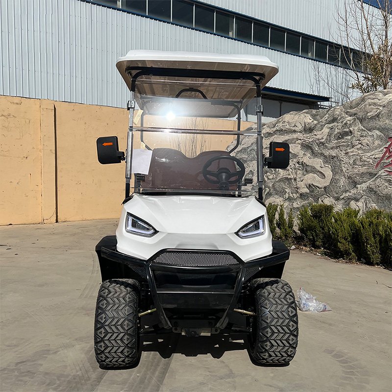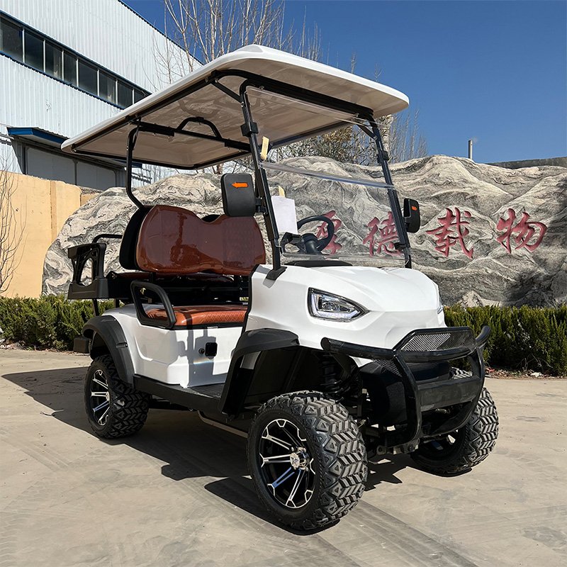A golf cart is a small vehicle designed primarily to carry golfers and their equipment around a golf course. These carts are typically electric or gas-powered and have a compact design suitable for navigating the narrow paths and fairways of a golf course. They usually have seating for two to four people, although larger models are available for transporting more passengers or cargo.